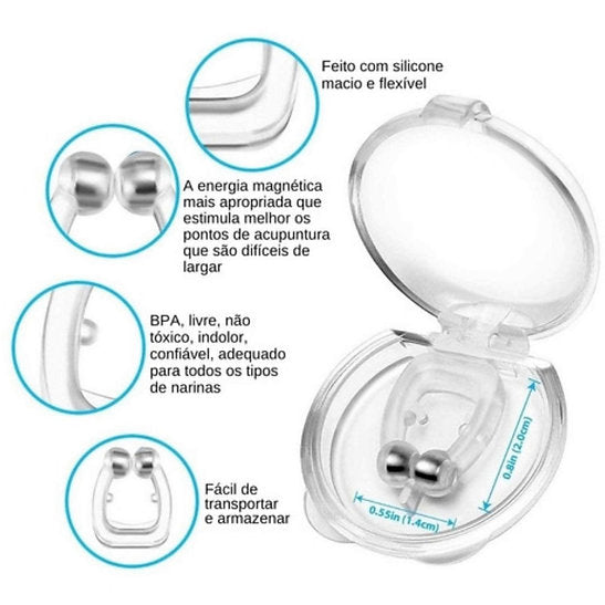 Os imãs (esferas) inseridos nas pontas tem a função de um dilatador nasal, fazendo com que as laterais das narinas não se estreitem quando você respira profundamente.