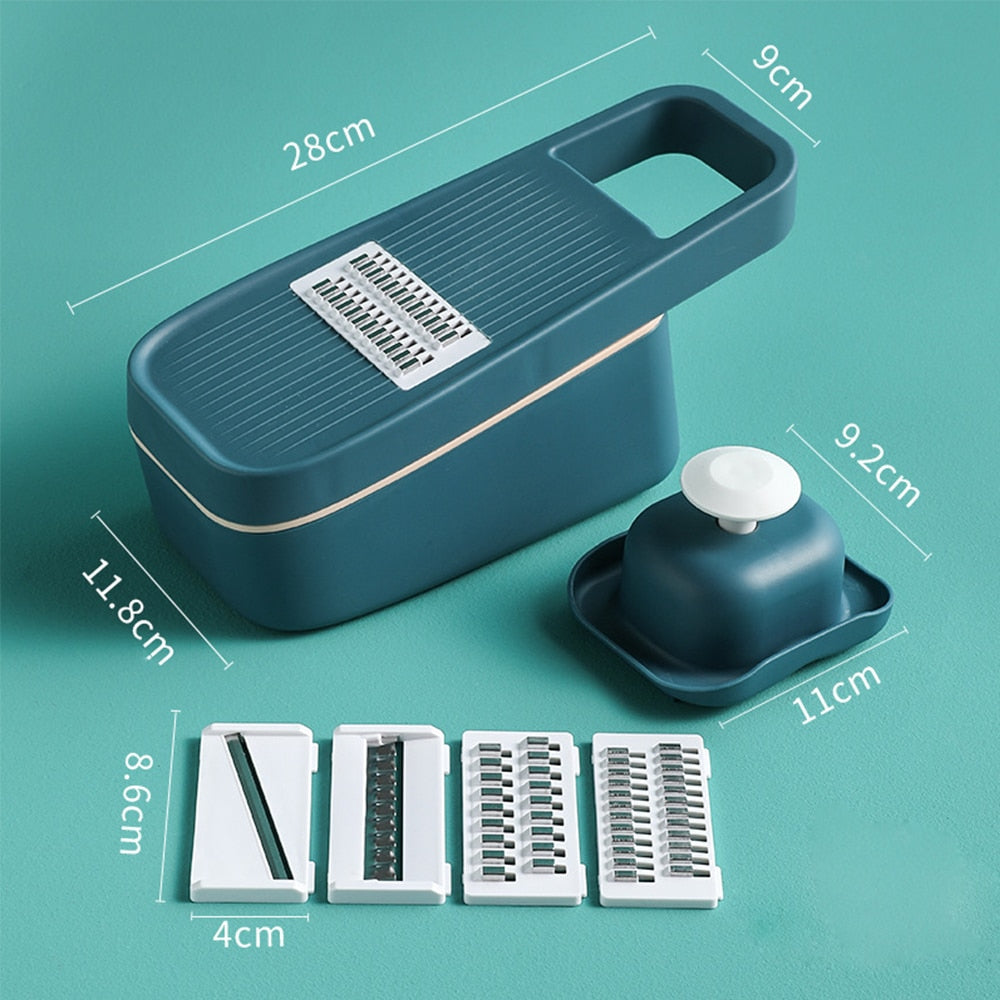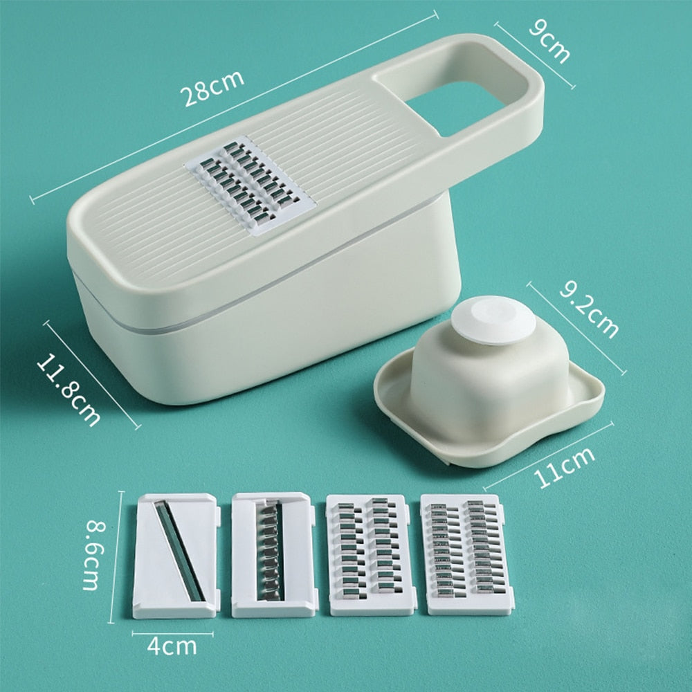Possuindo 7 lâminas destacáveis, é perfeito para todas as suas necessidades de fatiar, picar e ralar, e o seu recipiente permite até drenar os legumes com apenas 1 utensílio.